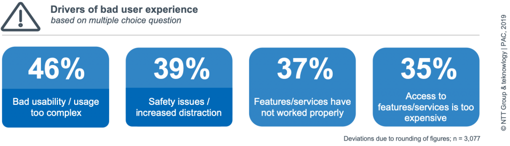 Against this background, NTT Group, in collaboration with teknowlogy | PAC, conducted an online survey of more than 3,000 drivers from Germany, UK, Italy and Spain to evaluate today’s drivers’ experiences, expectations and concerns regarding connected car services and technologies. In order to include the industry perspective, 20 expert interviews were conducted with automotive experts from OEMs, automotive suppliers, IT and insurance providers as well as the public sector.